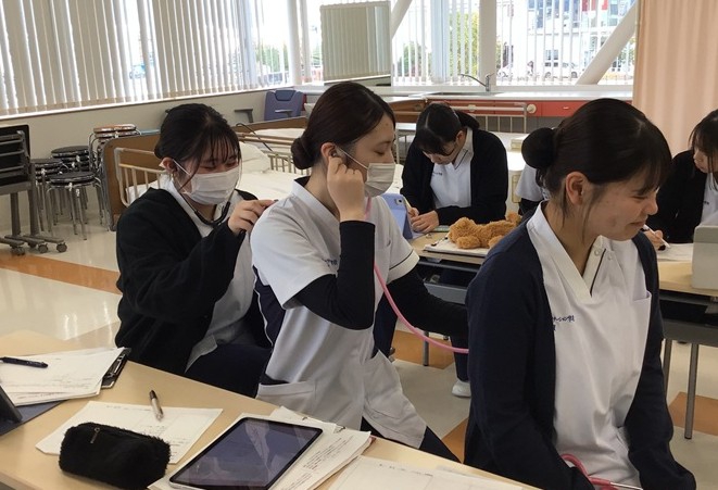 1年生は後期からヘルスアセスメントの授業が始まり、血圧などのバイタルサイン測定の技術試験が先週ありました。