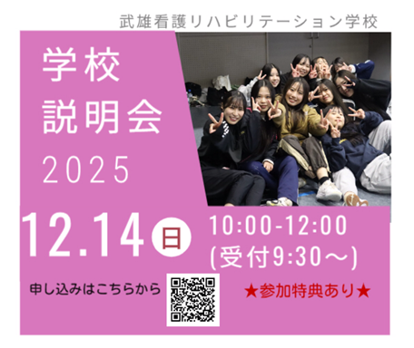 12月14日(日)に学校説明会があります。申し込みはこちらから→学校説明会のお申込み|武雄看護リハビリテーション学校